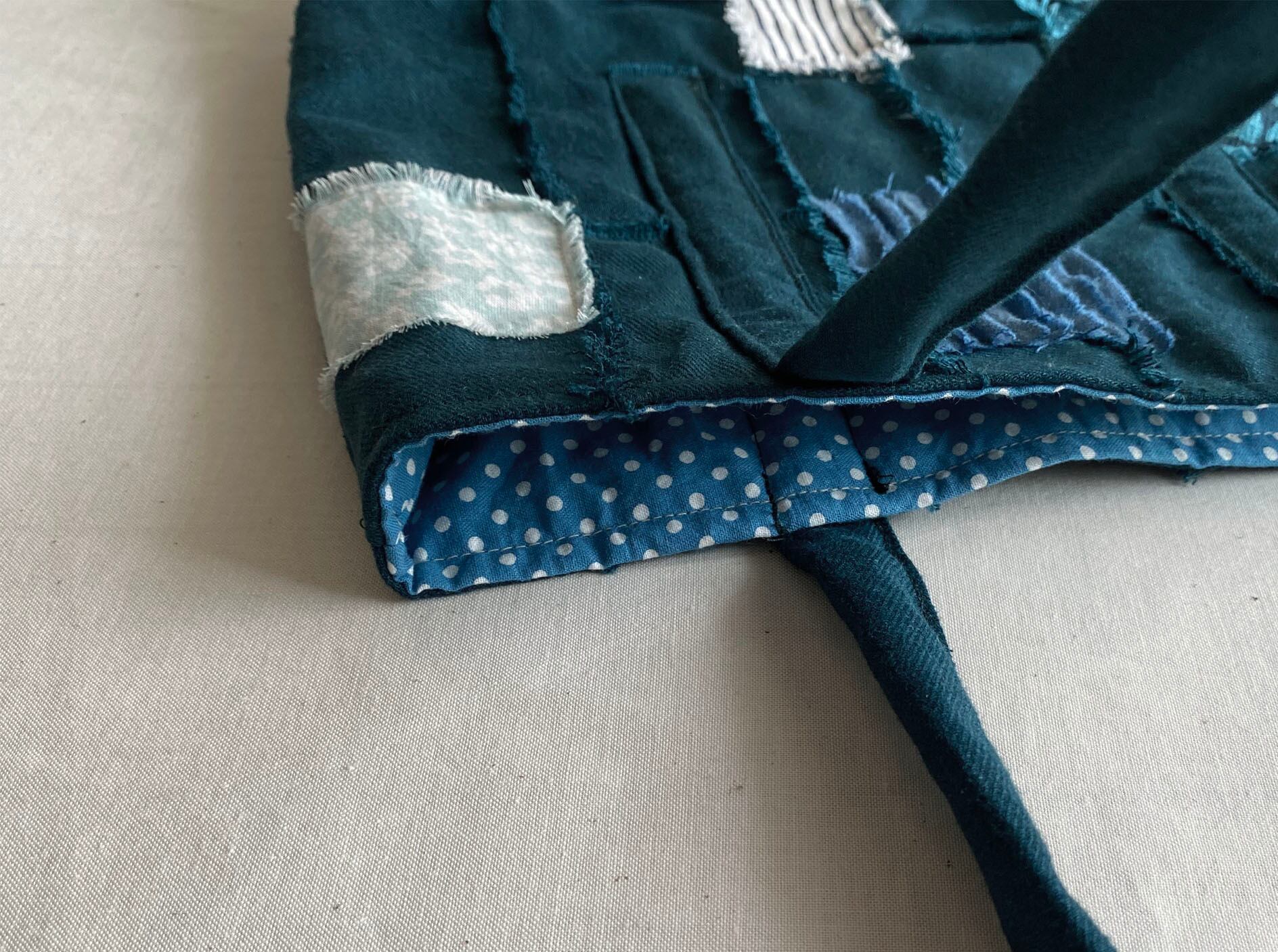 ストライプとドロップとお花はインドの手刷りプリントの布、ブルーグリーンはイタリアのリネン、内布は日本のコットン、ピンタックのような部分は裂き織りの着物生地を縫い付けています。