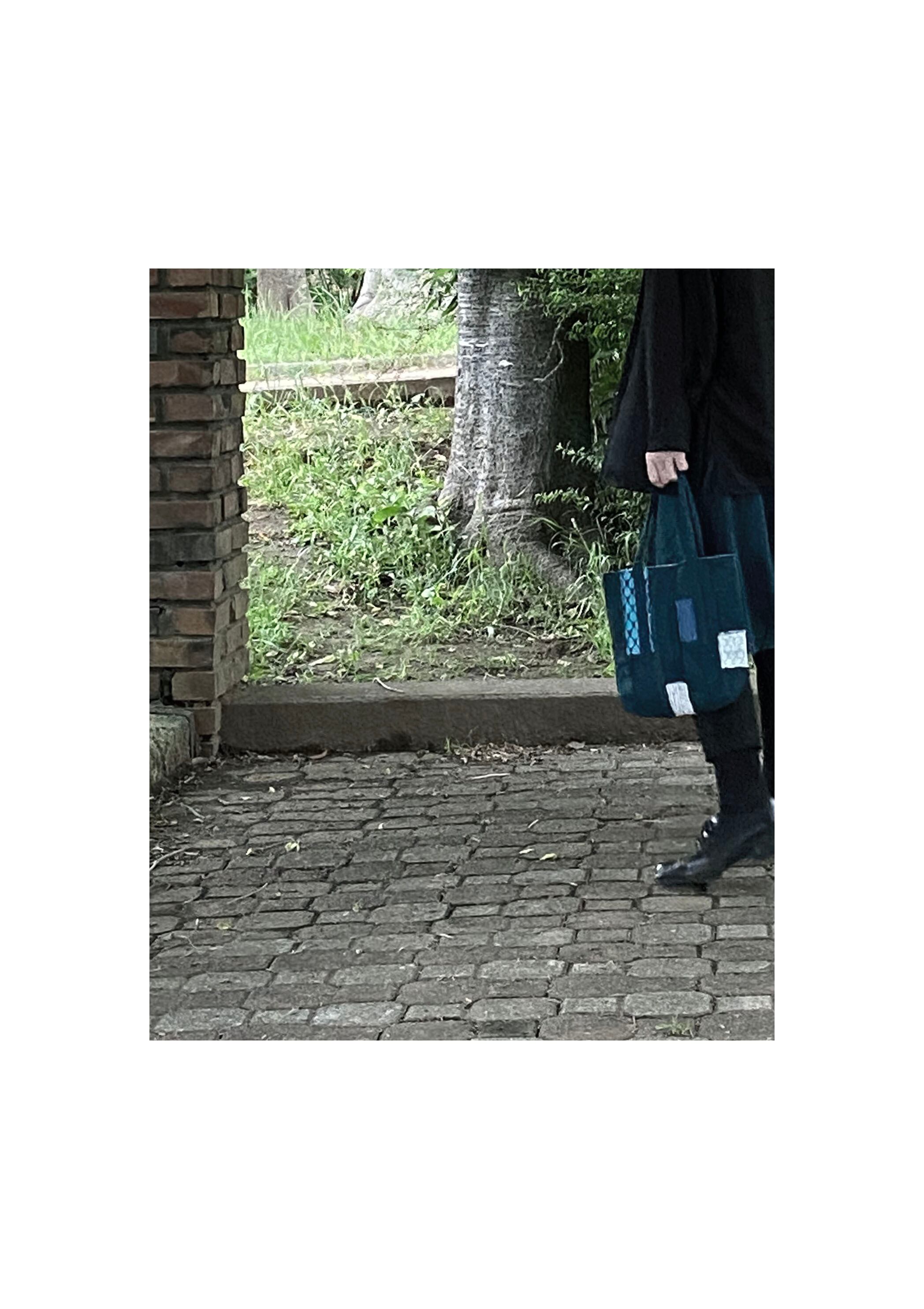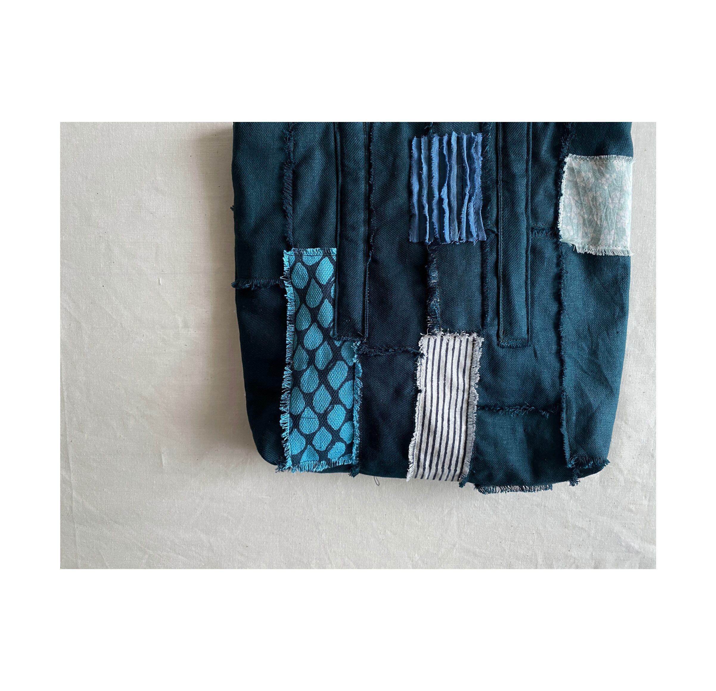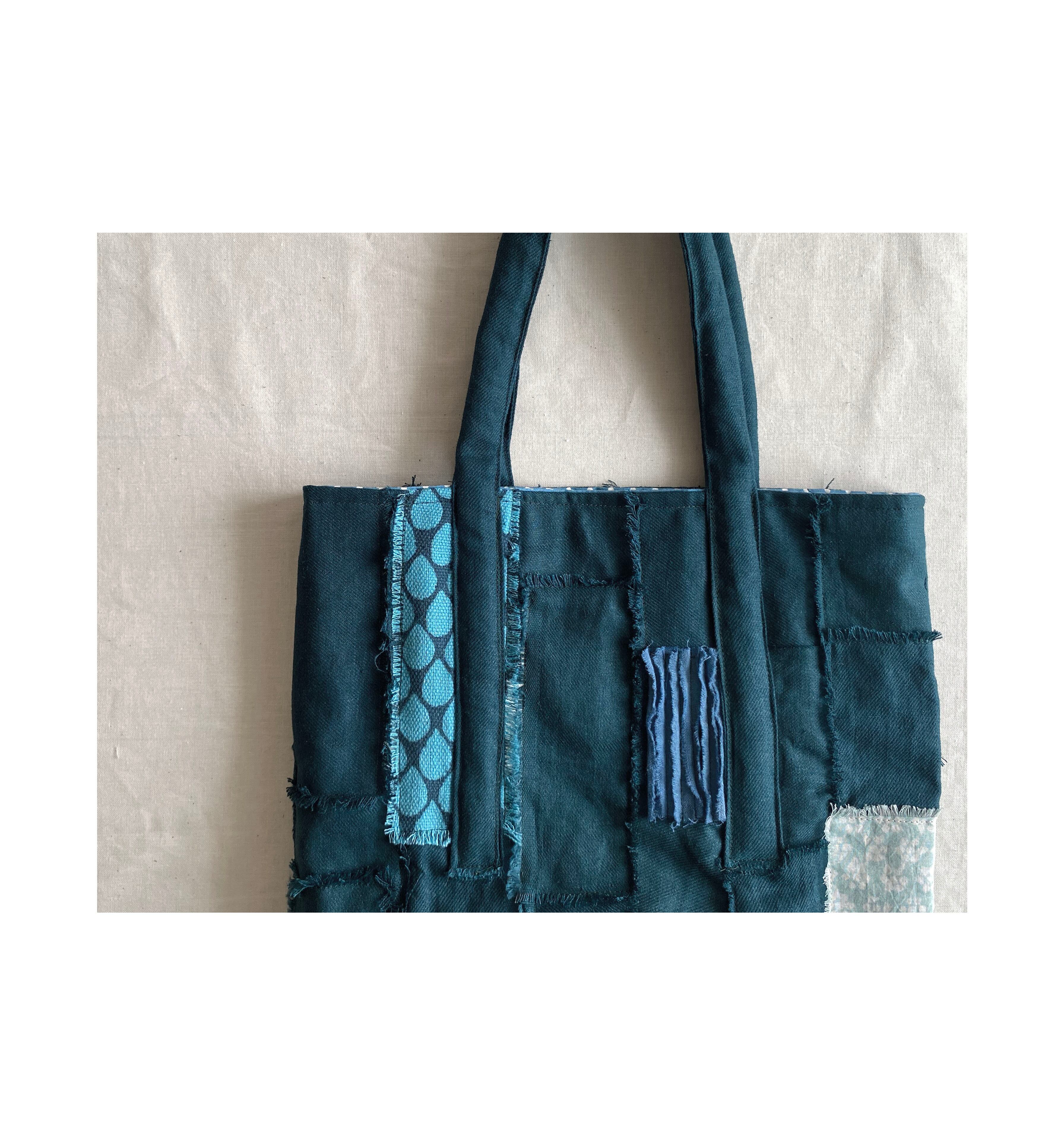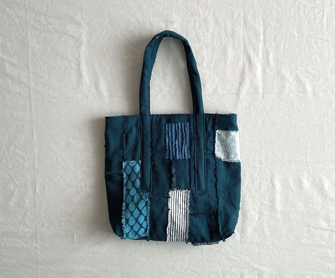制作時に出る小さなはぎれを縦長に繋ぎ合わせたトートバッグです。