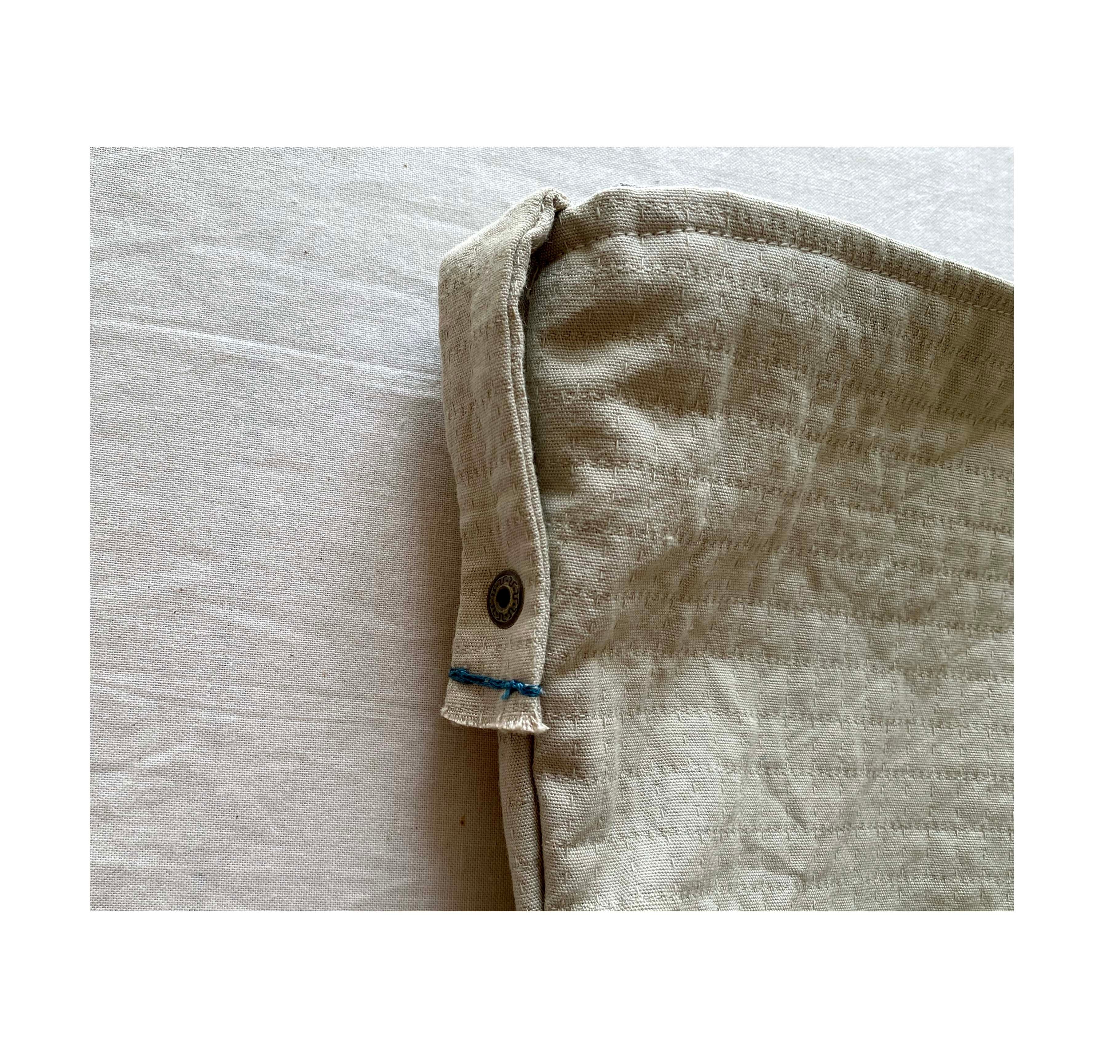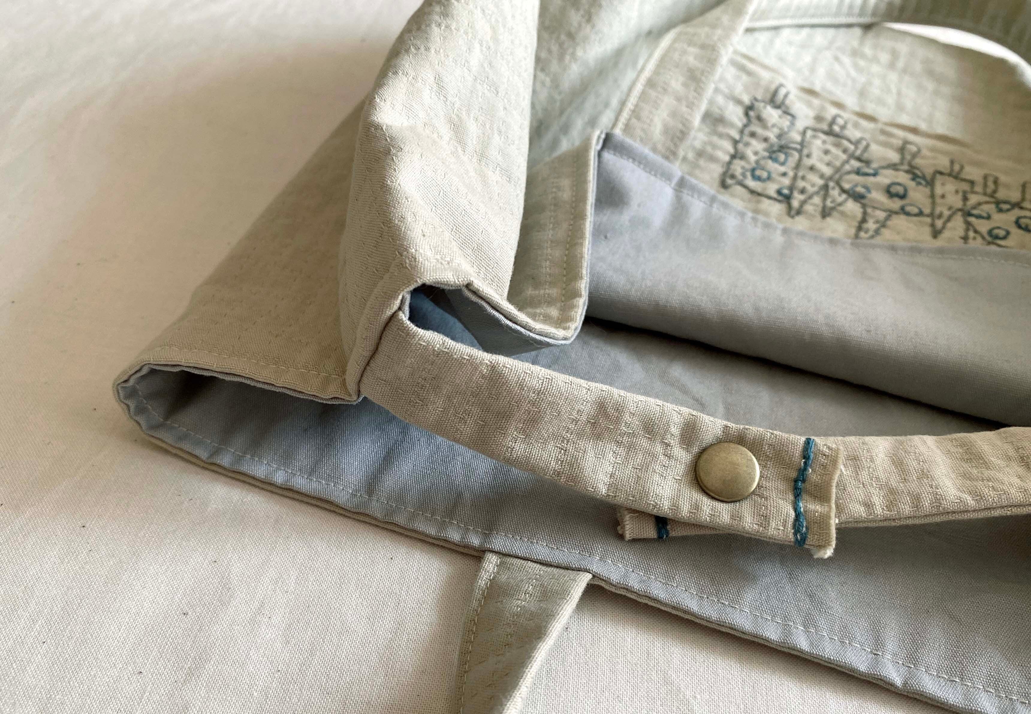 青い月と森の刺繍をした物がたっぷり入るバッグです。表の生地は二重織りの綿でしっかりした感触ながら、独自で素朴な風合い。中はライトパープルの綿で撥水加工がされています。サイドにスナップボタンが付いているのでお好みで留めてみても。買い物の途中で秘密の森を抜けていくような、日常と非日常どちらも感じられるバッグです。