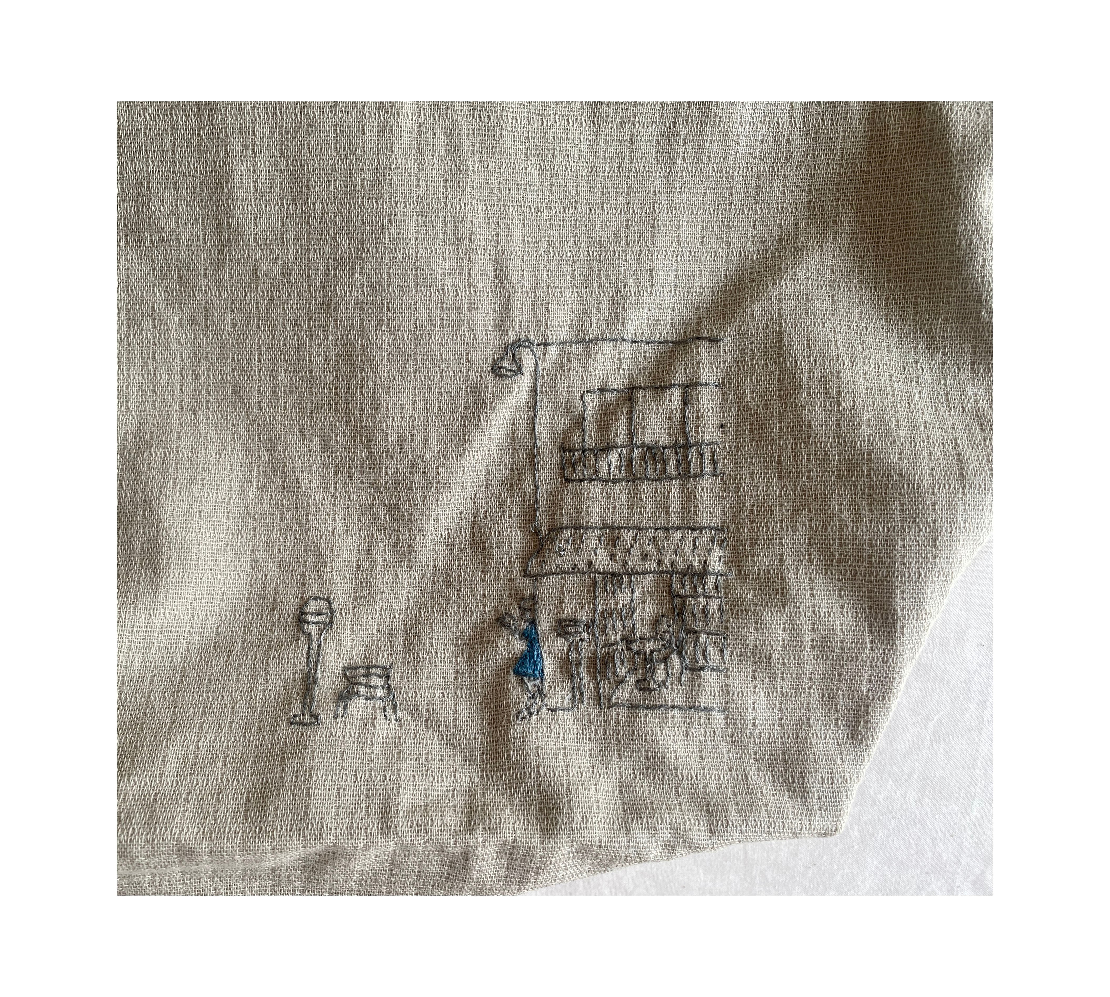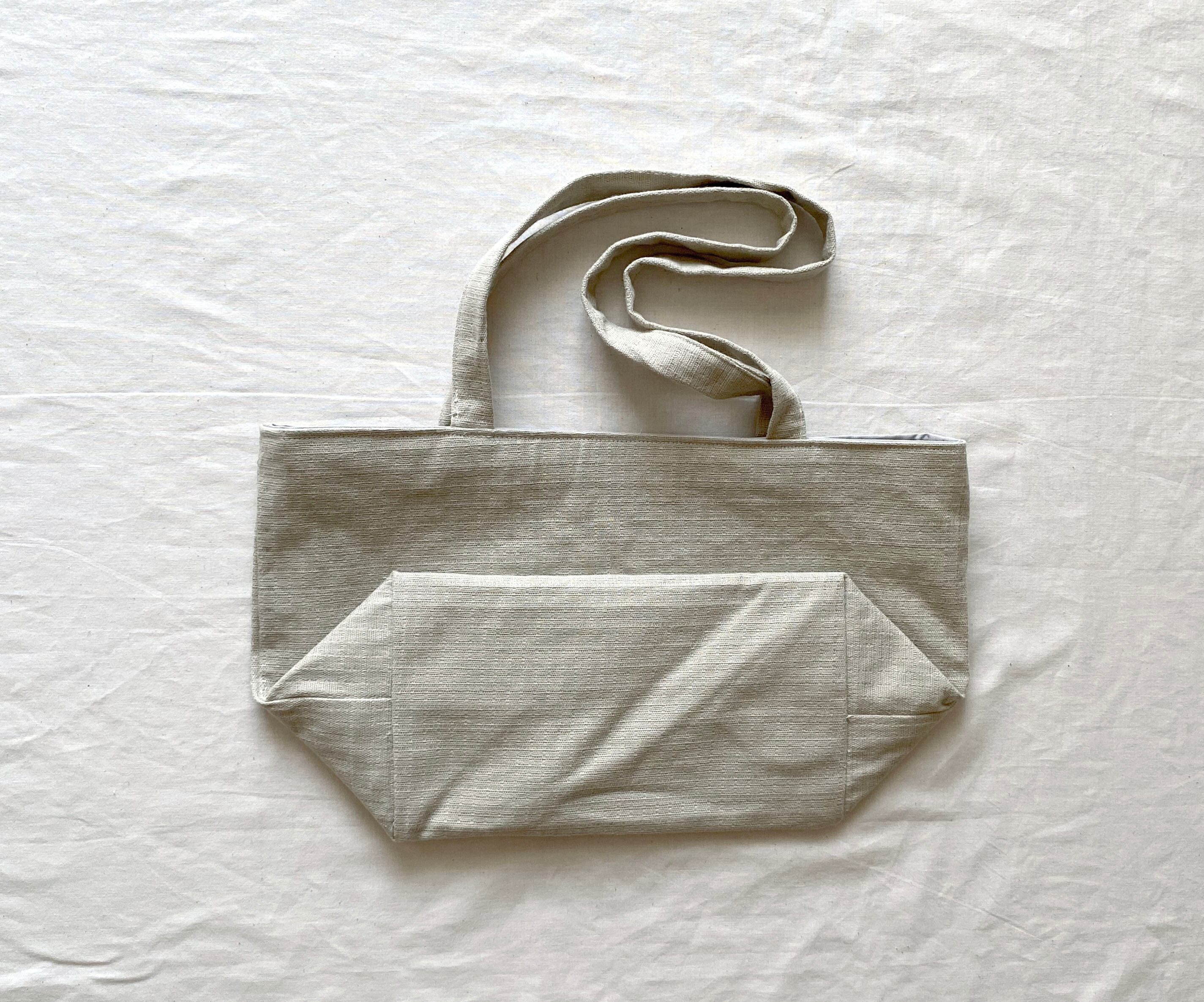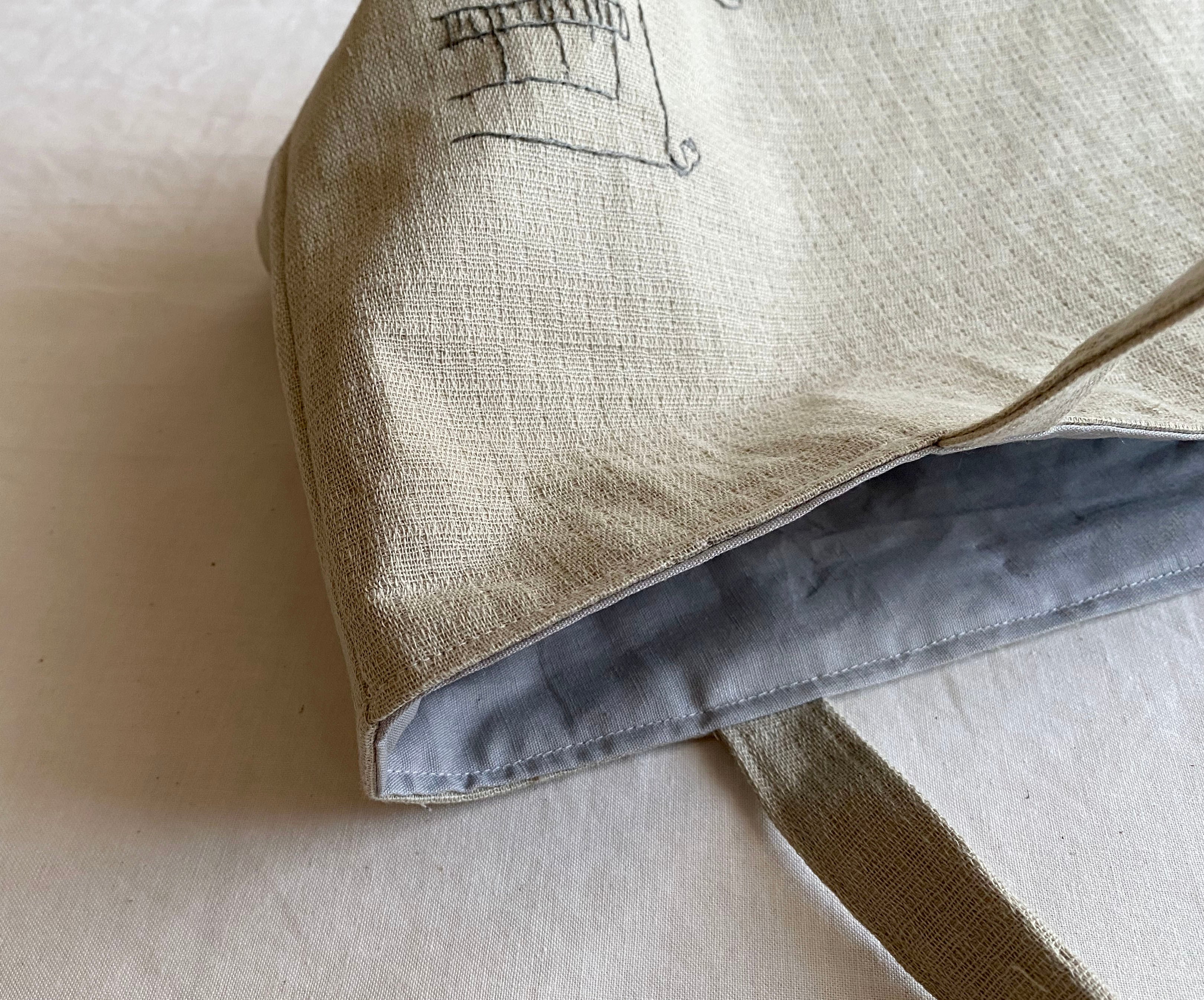 青いワンピースの女の子を刺繍したバッグです。二重織りの綿でしっかりした感触で素朴な風合い。中はライトパープルの綿で撥水加工がされています。今日わたしは本屋さんで時間を忘れてしまいました。道草はいつだって楽しい。
